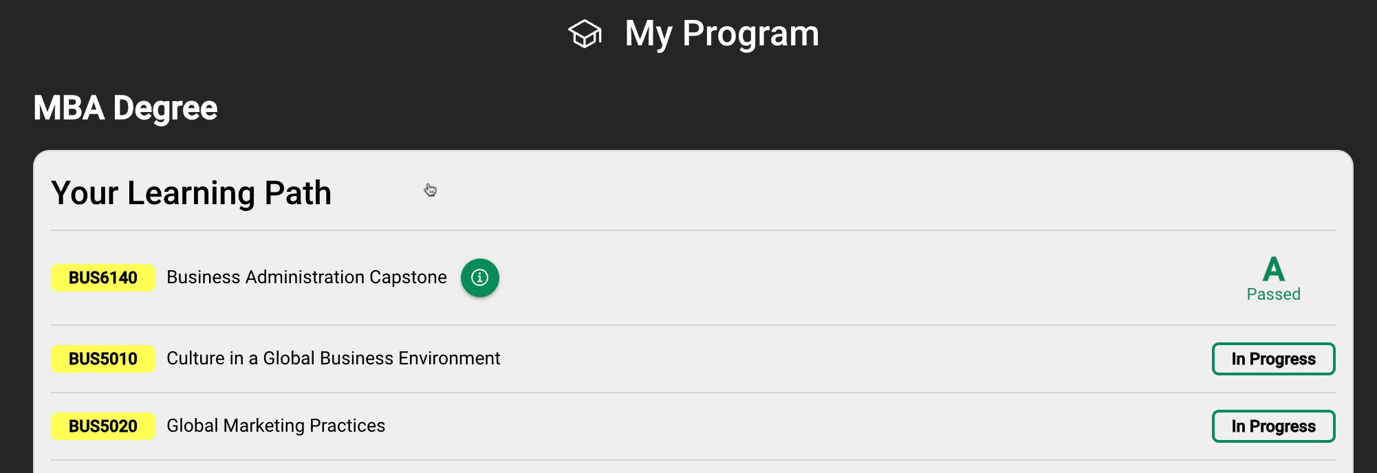 To view your program progress and scores on completed courses, view Your Learning Path. You will see the score for all completed courses.
